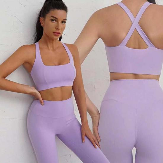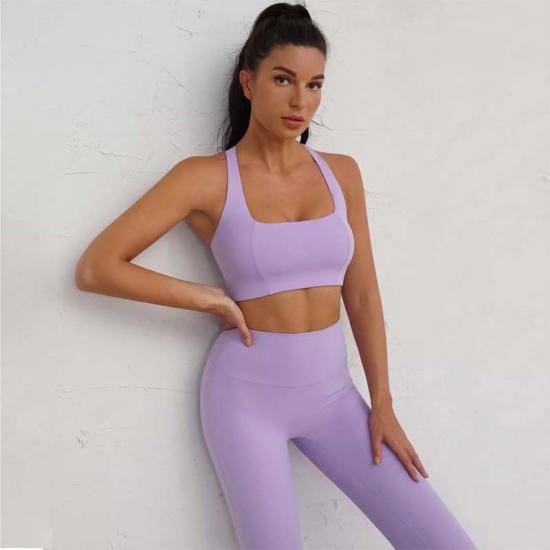 Available in a soft pastel color palette like lavender, this sport bra and yoga pants set combines minimalism with elegance, making it suitable for both fitness and casual wear.
